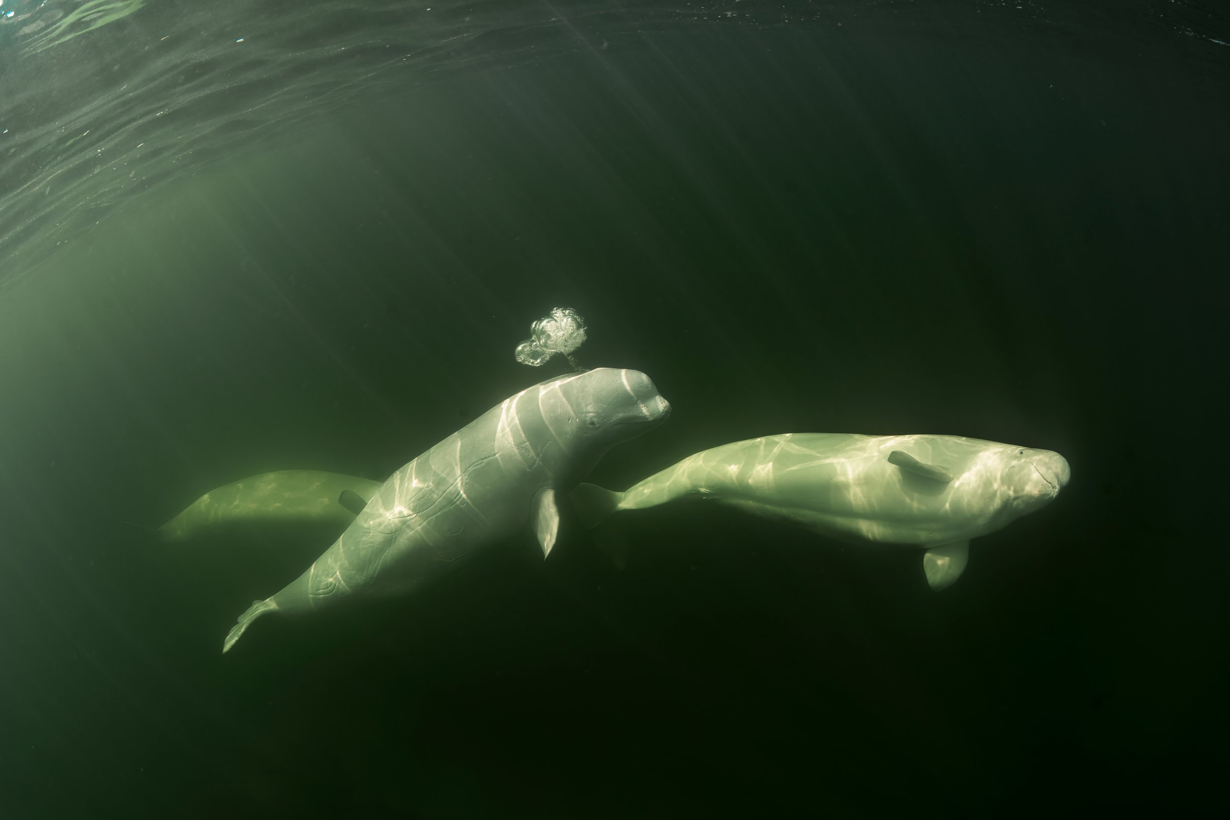 these belugas were endlessly endearing — but put them in the water with a polar bear and you quickly see mother nature’s sense of humor. shortly after these photos were taken, a small pod of belugas turned the bear into the unwilling star of their own soda pop commercial. They dove deep, circled close, and surfaced with streams of bubbles aimed squarely at his rear. the bear, clearly annoyed, could only gaze back at us in exasperation, knowing there was nothing he could do about the cheeky bullies who had spoiled his cold bath